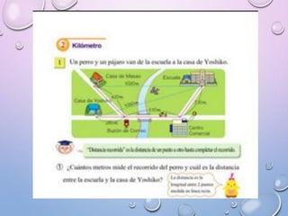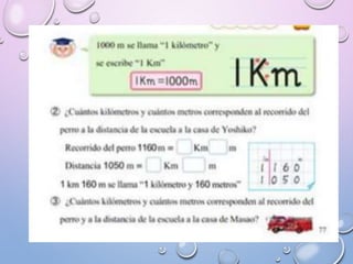 El documento explica cómo medir longitudes de varios metros usando una cinta métrica, define el kilómetro como una unidad de longitud equivalente a 1000 metros, y describe cómo los niños pequeños usan referencias personales como su cuerpo para ubicar objetos y establecer relaciones espaciales entre objetos basadas en su dirección, orientación, proximidad y si están dentro o fuera de otros objetos.