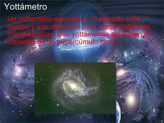 Este documento describe las unidades de longitud que van desde los yottámetros, utilizados para medir distancias intergalácticas de 1024 metros, hasta los yoctómetros de 10-24 metros. Explica cada unidad prefija del Sistema Internacional de Unidades y ejemplos de su uso para medir distancias astronómicas, del cuerpo humano y a nivel atómico y subatómico.