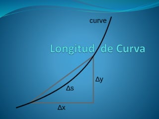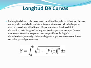 Este documento describe varios métodos para calcular la longitud de una curva. Explica que históricamente ha sido difícil determinar la longitud de segmentos irregulares, pero que el cálculo trajo fórmulas generales para algunos casos. Luego detalla que la longitud se puede aproximar sumando segmentos rectos pequeños o eligiendo puntos en la curva, y que para curvas suaves se puede usar el teorema de Pitágoras. Finalmente, presenta fórmulas para calcular la longitud cuando la curva está definida de forma paramétrica o polar.
