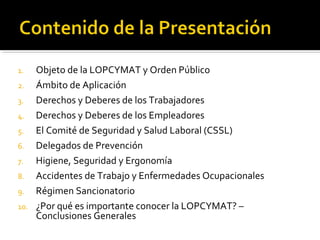 El documento resume los principales puntos de la Ley Orgánica de Prevención, Condiciones y Medio Ambiente de Trabajo de Venezuela. Establece los derechos y deberes de los trabajadores y empleadores, la creación de comités de seguridad laboral, delegados de prevención, define accidentes de trabajo y enfermedades ocupacionales, y establece un régimen sancionatorio para quienes incumplan con la ley.