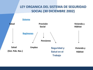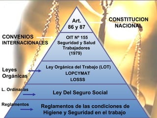 Este documento describe la Ley Orgánica del Sistema de Seguridad Social de un país, la cual regula los derechos y deberes de trabajadores y empleadores en relación a la seguridad y salud laboral. Establece dos organismos principales: el INPSASEL, encargado de la política de seguridad laboral e inspecciones, y el INCRET, que promueve programas de recreación y capacitación para trabajadores. La ley busca garantizar condiciones de seguridad y salud mediante la prevención de accidentes laborales y enfer