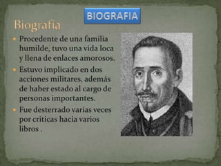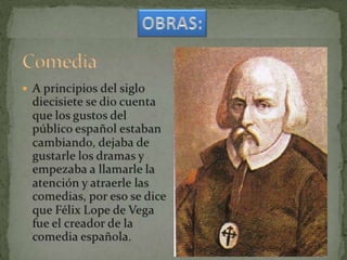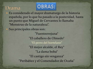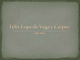 Félix Lope de Vega y Carpio fue uno de los más importantes dramaturgos y poetas del Siglo de Oro español. Nació en Madrid en 1562 y creó una extensa y prolífica obra literaria que revolucionó el teatro español en su época. A lo largo de su vida, Lope de Vega tuvo varios conflictos que lo llevaron al destierro en diferentes ocasiones, se casó dos veces y tuvo varios hijos. Falleció en Madrid en 1635 siendo reconocido y elogiado por muchos autores por su importante contrib