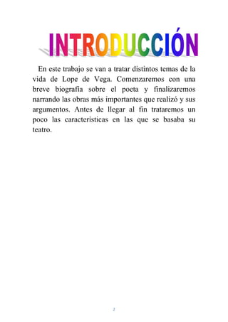 Este documento presenta una biografía breve del dramaturgo y poeta español Lope de Vega, incluyendo detalles sobre su vida y familia. Luego resume las características principales de su teatro, como la mezcla de lo trágico y cómico, y la inclusión de bailes y cantos populares. Finalmente, ofrece resúmenes de algunas de sus obras más importantes como La discreta enamorada, Peribáñez y el Comendador de Ocaña y Fuenteovejuna.