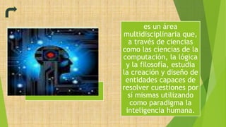 La inteligencia artificial es un área multidisciplinaria que estudia la creación de entidades capaces de resolver problemas utilizando la inteligencia humana como paradigma. John McCarthy acuñó el término en 1956 y lo definió como la ciencia e ingenio de hacer máquinas inteligentes, especialmente programas de computadora inteligentes. Existen diferentes categorías y escuelas de pensamiento dentro de la inteligencia artificial.
