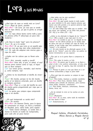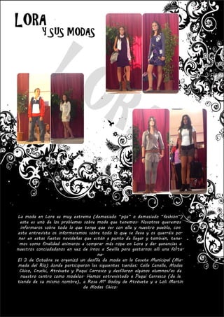 Este documento resume una entrevista con dueñas de tiendas de ropa en Lora sobre las tendencias y ventas de moda. Según las entrevistadas, la ropa clásica y deportiva se vende más, aunque los jóvenes también siguen las tendencias "pijas". Los colores populares este año son grises, morados y azules. La gente suele comprar ropa para eventos como bodas y comuniones. La crisis ha afectado negativamente las ventas, especialmente a mediados de mes.