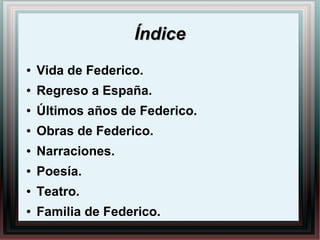 Este documento resume la vida y obra del poeta y dramaturgo español Federico García Lorca. Nació en 1898 en Granada y se dedicó a la poesía y el teatro. Algunas de sus obras más importantes fueron el Romancero gitano, Bodas de sangre y Yerma. Regresó a España en 1932 para dirigir teatros y transmitir su pasión por el arte dramático. Sus últimos años los dedicó al teatro hasta su trágica muerte fusilado durante la guerra civil española en 1936.