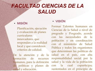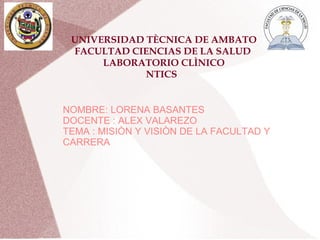 El documento describe la misión y visión de la Facultad de Ciencias de la Salud y de la Carrera de Laboratorio Clínico de la Universidad Técnica de Ambato. La misión de la Facultad es planificar e implementar programas innovadores que respondan a las necesidades locales y cumplan con estándares de calidad, además de formar recursos humanos para definir políticas de salud. Su visión es formar profesionales de la salud de acuerdo a las necesidades de la población y en coordinación con el Ministerio de Salud Pública.