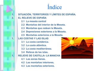 Este documento describe el relieve de España y de Castilla-La Mancha. En España, destaca la Meseta Central y varias cordilleras montañosas como los Pirineos, los Sistemas Béticos y la Cordillera Cantábrica. Las costas españolas están bañadas por el mar Cantábrico, el Atlántico y el Mediterráneo. Castilla-La Mancha tiene zonas llanas como La Mancha y montañas interiores como los Montes de Toledo y Sierra Morena en el sur.