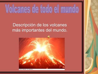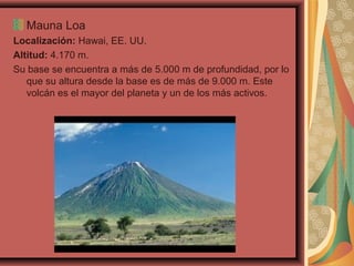 Este documento describe los volcanes más importantes del mundo, incluyendo el Mauna Loa en Hawái, que es el volcán más grande del planeta; el Kilaeua en Hawái, que ha estado en erupción continua desde 1983; y el Krakatoa en Indonesia, cuya erupción en 1883 destruyó la isla y causó más de 36,000 muertes.