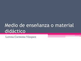 Este documento clasifica y describe diferentes tipos de medios de enseñanza o materiales didácticos, incluyendo medios manipulativos, impresos, audiovisuales, auditivos y digitales. Los medios manipulativos permiten una representación enactiva del conocimiento a través de objetos, materiales y recursos. Los medios impresos incluyen libros, folletos y periódicos. Los medios audiovisuales utilizan medios de comunicación para capacitar a los estudiantes de manera crítica. Los medios auditivos son casetes, tocadis