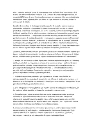 1) En 1876, Lorenzo Latorre asumió como gobernador provisional de Uruguay en medio de un período de inestabilidad política y desorden. 2) Implementó reformas que modernizaron al país, incluyendo el establecimiento de la educación pública, laica y obligatoria, y mejoras en la infraestructura, producción agrícola y sistema judicial. 3) Se le considera el principal estadista de Uruguay y el fundador de su estado moderno debido a las profundas transformaciones que impulsó durante su gobierno.