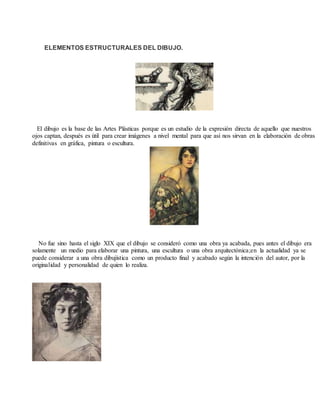 El documento describe los elementos estructurales del dibujo como una forma de expresión artística y una herramienta para otras artes plásticas. Explica que el dibujo evolucionó de ser solo un medio para otras obras a considerarse una obra en sí mismo en el siglo XIX. También detalla los pasos básicos para elaborar un dibujo como apuntes, bocetos, proyectos y el aspecto de una obra concluida.