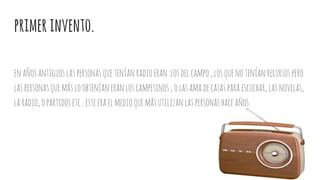 Este documento resume los 10 inventos más importantes de la historia. Entre ellos se encuentran la radio, la televisión, los teléfonos celulares, los computadores, Internet, los refrigeradores, los automóviles, los aviones, las tarjetas de crédito y las memorias USB. Cada uno de estos inventos revolucionó la forma en que las personas se comunican, trabajan y viven en el mundo moderno.