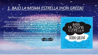 Este documento presenta un resumen de los 10 libros más queridos por los jóvenes. Entre ellos se encuentran Bajo la misma estrella de John Green, que trata sobre el amor entre dos adolescentes que padecen cáncer; Crepúsculo, que renovó los relatos sobre vampiros con historias de amor entre humanos y seres sobrenaturales; y Cincuenta sombras de Grey, la cual narra la controvertida relación entre la estudiante Anastasia y el adinerado y dominante Christian Grey.