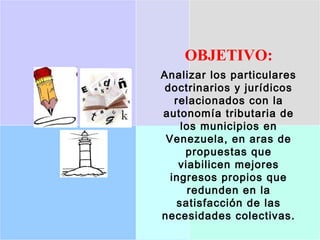 Este documento resume los conceptos clave sobre la tributación municipal en Venezuela. Explica que los municipios son la unidad política primaria del país y gozan de autonomía política, normativa, administrativa y tributaria. Detalla los principales instrumentos jurídicos municipales como ordenanzas, acuerdos, decretos y resoluciones. También analiza los principios de la hacienda pública municipal como legalidad, eficiencia, transparencia y equilibrio fiscal. El objetivo es mejorar los ingresos propios municipales para satisfacer las necesidades colectivas.