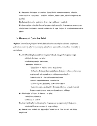Este documento presenta los 20 elementos de un programa de seguridad y salud ocupacional. Cada elemento describe un objetivo y los componentes necesarios para implementarlo. Los elementos incluyen análisis de accidentes, comunicaciones, entrenamiento, equipo de protección personal, inspecciones, investigación de accidentes, liderazgo, preparación para emergencias y un sistema de evaluación. El objetivo general es establecer un programa completo para identificar y controlar riesgos laborales y proteger la salud y seguridad de los empleados.