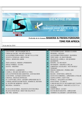 Este documento presenta una lista de los 40 temas musicales más populares de la semana en Latinoamérica. La lista incluye artistas populares como Shakira, Alejandro Sanz, Chayanne, Luis Fonsi, Belinda y Juan Luis Guerra.