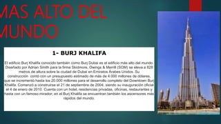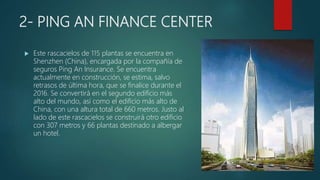 El documento describe los cinco edificios más altos del mundo. El primero y más alto es el Burj Khalifa en Dubai con 828 metros. El segundo es el Ping An Finance Center en Shenzhen, China con 660 metros y actualmente en construcción. El tercero es la Tokyo Sky Tree en Tokio, Japón con 634 metros.