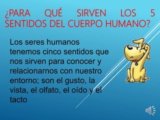 Los seres humanos tienen cinco sentidos - vista, oído, gusto, tacto y olfato - que nos permiten percibir y comprender nuestro entorno. La vista nos permite ver formas y colores, el oído escuchar sonidos, el gusto catar sabores, el tacto sentir texturas y temperaturas, y el olfato oler aromas. Cada sentido se encuentra en una parte diferente del cuerpo y cumpla una función distinta, pero todos juntos nos ayudan a interactuar con el mundo que nos rodea.