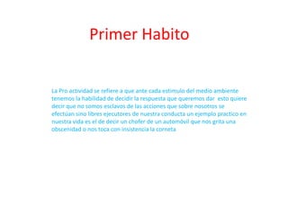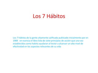 El documento resume los 7 hábitos de la gente altamente efectiva descritos en el libro de Stephen Covey. Los 7 hábitos son: 1) ser proactivo, 2) comenzar con un fin, 3) poner primero lo importante, 4) pensar en mutuo beneficio, 5) comprender primero el otro punto de vista, 6) sinergizar, y 7) afilar la sierra mejorando continuamente.