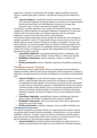 El documento describe 8 tipos de inteligencia: inteligencia lingüística, musical, lógico-matemática, espacial, corporal-kinestésica, intrapersonal, interpersonal y naturalista. Cada tipo se caracteriza por sus capacidades, habilidades y perfiles profesionales asociados. La inteligencia se puede manifestar de diversas formas y depende de factores biológicos como las áreas del cerebro involucradas.