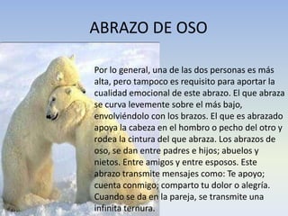 El documento describe diferentes tipos de abrazos, incluyendo el abrazo de oso, el abrazo de mejilla, el abrazo en forma de "A", el abrazo de sandwich, el abrazo impetuoso, el abrazo grupal, el abrazo de costado, el abrazo a la medida, el abrazo de corazón y el abrazo zen. Cada tipo de abrazo se caracteriza por la posición de los cuerpos y transmite diferentes emociones como apoyo, ternura, alegría o unidad. Finalmente, el documento