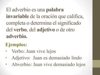 Este documento describe los adverbios, que son palabras que califican, completan o determinan el significado de un verbo, adjetivo u otro adverbio. Explica que existen adverbios simples y compuestos, incluyendo los que terminan en "mente" y las locuciones adverbiales. Además, detalla los diferentes tipos de adverbios, como los de lugar, tiempo, modo, cantidad, afirmación, negación, duda y orden.