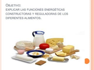 El documento explica las funciones de los diferentes alimentos. Los alimentos se clasifican en energéticos, constructores y reguladores según la función que tienen en el cuerpo. Los alimentos energéticos dan energía, los constructores ayudan a fortalecer el cuerpo, y los reguladores ayudan a mantener el buen funcionamiento del cuerpo. Todos los alimentos contienen sustancias nutritivas importantes como carbohidratos, vitaminas, hierro y minerales.