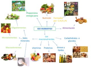 Los alimentos proporcionan energía y nutrición al cuerpo humano a través de macronutrientes como carbohidratos, proteínas y grasas, y micronutrientes como vitaminas, sales minerales y oligoelementos, todos los cuales son fundamentales para el funcionamiento del organismo.