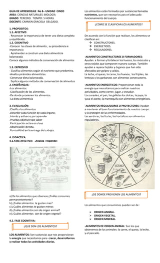 Este documento presenta una guía de aprendizaje para una unidad sobre nutrición y alimentación para estudiantes de tercer grado. La guía incluye objetivos afectivos y cognitivos relacionados con reconocer la importancia de una dieta balanceada y aprender sobre los diferentes tipos y clasificaciones de alimentos. También presenta enseñanzas sobre los alimentos, su clasificación, origen y la dieta alimenticia, así como actividades para evaluar el aprendizaje de los estudiantes.