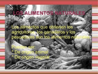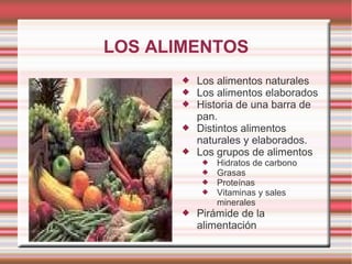 El documento describe diferentes tipos de alimentos, incluyendo alimentos naturales como frutas y verduras obtenidos de agricultores y ganaderos, y alimentos elaborados preparados a partir de ingredientes naturales como el pan. También explica los principales grupos de nutrientes en los alimentos como carbohidratos, grasas, proteínas, vitaminas y minerales, y presenta la pirámide de la alimentación.