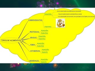 Los alimentos cumplen funciones químicas básicas como suministrar energía a las células y proveer materia prima para el crecimiento y mantenimiento de los tejidos. Los nutrientes principales son los carbohidratos, grasas, proteínas, vitaminas y minerales. Los alimentos se clasifican en energéticos, plásticos y reguladores dependiendo de su contenido nutricional.