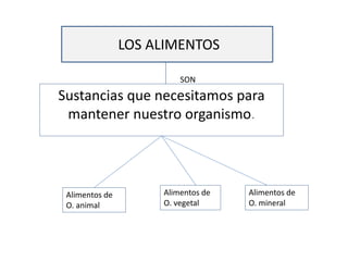 Este documento clasifica los alimentos en tres categorías principales según su origen: vegetal, animal y mineral. Además, los clasifica según su valor nutritivo en alimentos energéticos, que proveen energía; alimentos constructores, que forman músculos y tejidos; y alimentos protectores o reguladores, que mantienen el cuerpo funcionando de manera adecuada. Finalmente, pide al lector que complete una ficha de aplicación identificando cada tipo de alimento.