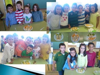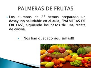 Los alumnos de 2o de primaria prepararon un desayuno saludable de "palmeras de frutas" siguiendo una receta de cocina. Como parte de su estudio de alimentación, analizaron etiquetas de alimentos y crearon catálogos sobre diferentes secciones de productos alimenticios. También aprendieron y cantaron la canción "La canción de los alimentos" y jugaron a "La pirámide de los alimentos".