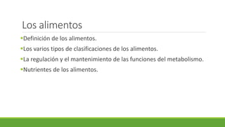 Los alimentos se definen como aquello que los seres vivos comen y beben para su subsistencia. Los alimentos se pueden clasificar por su composición como orgánicos o inorgánicos, o por su función como formadores, energéticos o reguladores. Los alimentos regulan y mantienen las funciones metabólicas y aportan nutrientes esenciales como vitaminas, proteínas, carbohidratos, agua y minerales que proporcionan energía y permiten el metabolismo.