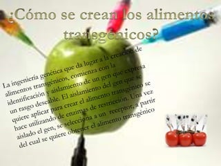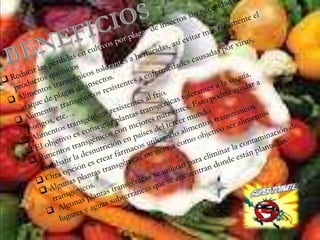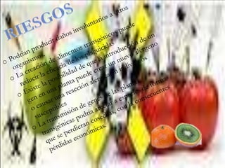 Este documento describe los alimentos transgénicos como aquellos derivados de organismos modificados genéticamente mediante ingeniería genética para introducir modificaciones en su ADN. Explica algunos ingredientes comunes transgénicos y destaca tanto las ventajas potenciales de los transgénicos como los posibles riesgos para la salud y el medio ambiente. Finalmente, enfatiza la importancia de informar a los consumidores sobre los transgénicos y abordar el tema con un enfoque bioético y científico.