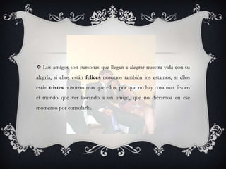 El documento describe la importancia y naturaleza de la amistad. Explica que los amigos están presentes durante los mejores y peores momentos y que la verdadera amistad se ve en tiempos difíciles. También discute diferentes tipos de amigos, incluyendo amigos leales, amigos que se pelean pero se quieren, amigos que fallan y amigos que se convierten en algo más como novios. Concluye resaltando la importancia de apoyar a los amigos y no dejar que las peleas destruyan las amistades.