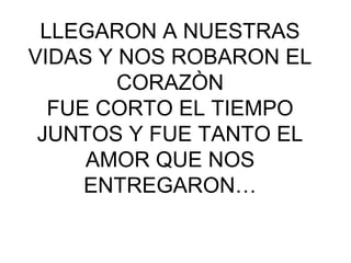 El documento habla sobre unos ángeles que llegaron a sus vidas y les robaron el corazón con su amor. Aunque el tiempo juntos fue corto, el amor que les entregaron fue mucho. Ahora es difícil decirles adiós, pero saben que están con Dios y son felices con los otros ángeles. Algún día se volverán a reunir para entregarles todo el amor que les faltó dar.