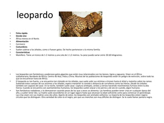 Los documentos describen tres grandes felinos: el leopardo, el león y el tigre. El leopardo vive en África y Asia y suele cazar sus presas en los árboles. Los leones viven en manadas en África y Asia, donde las leonas cazan para alimentar al grupo. El tigre, el felino más grande, habita en Asia y caza en solitario dentro de su amplio territorio.