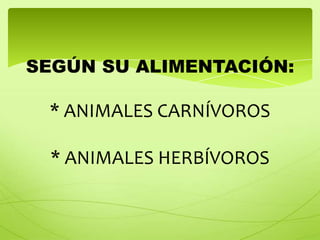 El documento clasifica los animales según su alimentación y forma de desplazamiento, dividiéndolos en carnívoros como el león y el tiburón que se alimentan de otros animales, y herbívoros como el elefante y la vaca que comen plantas. Además, describe cómo se mueven los animales, ya sea caminando con patas, volando con alas o nadando con aletas.
