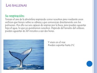 El documento describe la respiración y hábitat de varios animales. Las ballenas respiran a través de orificios en la cabeza y pueden aguantar la respiración de 20 minutos a 2 horas bajo el agua. La estrella de mar intercambia gases a través de pápulas en su cuerpo y vive en el océano Atlántico. Los caracoles respiran a través de su piel húmeda y viven en lugares húmedos en todo el mundo. La mariposa respira a través de tráqueas y