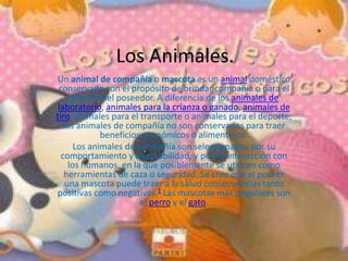 Este documento presenta información sobre diferentes animales de compañía y mascotas populares como perros, gatos, canarios, conejos, caballos, cuyes y peces. Explica que los animales de compañía se mantienen principalmente para compañía y disfrute personal, a diferencia de otros animales que proveen beneficios económicos. Describe brevemente las características y roles de varios animales comúnmente mantenidos como mascotas.