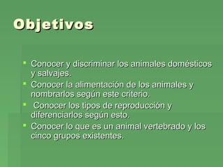 Este documento presenta un plan de lecciones sobre los animales. El objetivo es que los estudiantes aprendan a distinguir entre animales domésticos y salvajes, su alimentación, tipos de reproducción y los cinco grupos de vertebrados. Las actividades incluyen identificar animales, colorear su alimentación, investigar su reproducción y esqueletos. También habrá lectura de cuentos, elaboración de fichas de animales y murales colaborativos.