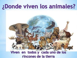 Este documento describe las características generales de los animales. Explica que los animales se dividen en grupos dependiendo de si tienen esqueleto o no, su medio de vida como terrestre, acuático o aéreo, y su dieta como carnívoros, herbívoros u omnívoros. También cubre los diferentes medios de locomoción como volar, nadar, correr o reptar. Algunos animales realizan largas migraciones para reproducirse o alimentarse.