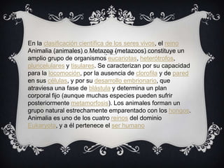 Los animales constituyen un amplio grupo de organismos eucariotas, pluricelulares y tisulares que se caracterizan por su capacidad para moverse, por carecer de clorofila y tener células sin pared. Los animales pasan por etapas de desarrollo embrionario como la blástula que determina su forma corporal fija, y forman un reino emparentado con los hongos dentro del dominio de los eucariotas.