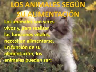 El documento clasifica los animales según su alimentación, desplazamiento y reproducción. Respecto a la alimentación, distingue entre herbívoros, carnívoros y omnívoros. En cuanto al desplazamiento, habla de animales que vuelan, nadan o se desplazan por tierra. Finalmente, en la reproducción diferencia entre animales ovíparos, que nacen de huevo, y vivíparos, que nacen del vientre de la madre.