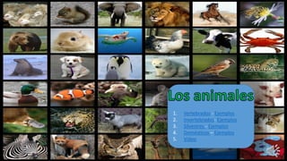 Este documento clasifica los animales en cuatro categorías principales: vertebrados, invertebrados, silvestres y domésticos. Los vertebrados tienen esqueleto óseo o cartilaginoso y se dividen en mamíferos, aves, peces, reptiles y anfibios. Los invertebrados carecen de columna vertebral y esqueleto interno, constituyen el 95% de los animales y se agrupan en artrópodos, moluscos, equinodermos, gusanos y poríferos. Los animales silvestres v