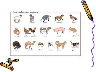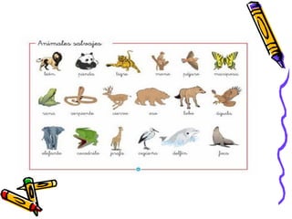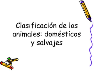 Este documento clasifica los animales en dos grupos principales: animales domésticos y animales salvajes. Los animales salvajes viven en la naturaleza y deben luchar para sobrevivir, mientras que los animales domésticos han sido habituados a vivir con los seres humanos. También destaca que todos los animales tienen derechos como la libertad y la protección contra el maltrato, y que los seres humanos deben respetarlos.
