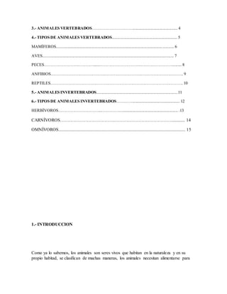 El documento ofrece una descripción detallada de los animales, clasificándolos en vertebrados e invertebrados y abarcando tipos específicos como mamíferos, aves, peces, anfibios y reptiles. Se discuten características morfológicas y fisiológicas, así como sus hábitos de reproducción y alimentación. Además, se resalta la importancia de la zoología en el estudio de estas especies y su lugar en la cadena alimentaria.