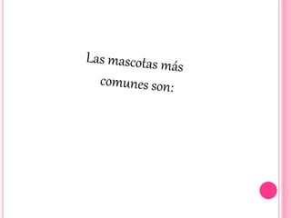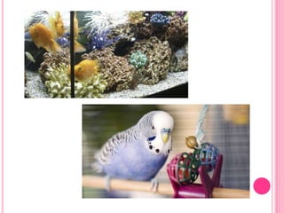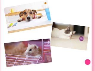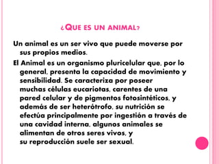 El documento describe qué es un animal, definiéndolo como un organismo pluricelular que se mueve y tiene sensibilidad, y menciona las diferencias entre animales domésticos y salvajes. Se detallan algunas de las mascotas más comunes, como perros, gatos, hámsteres y peces, así como datos curiosos sobre diferentes especies. También se menciona el estado de algunos animales en peligro de extinción.